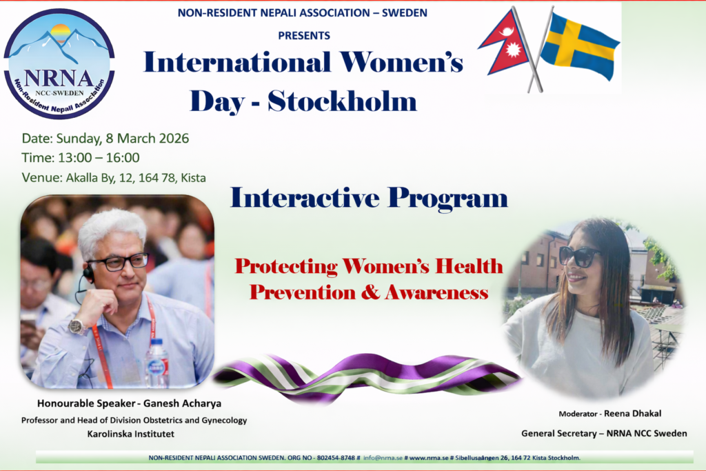 अन्तर्राष्ट्रिय महिला दिवसको अवसरमा गैरआवासीय नेपाली संघ स्वीडेनले “महिलाहरुको स्वास्थ्य संरक्षण र स्त्रीरोगसम्बन्धी सचेतना” विषयमाअन्तरक्रियात्मक कार्यक्रम आयोजना गरेको जानकारी गराउन चाहन्छौ।